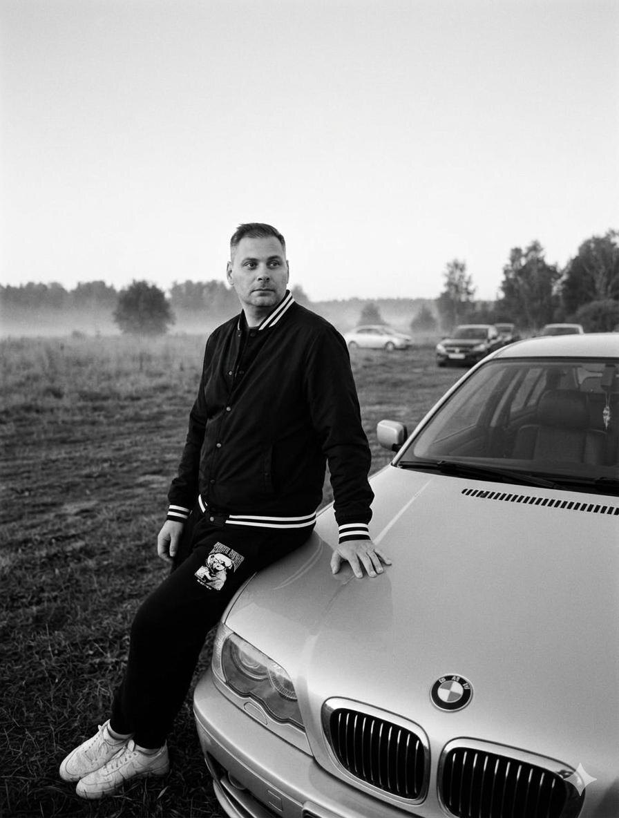 Модель: Nano Banana Сгенерировать🪄 Молодой человек европейской внешности, с короткой стрижкой и внимательным взглядом, одет в черную куртку-бомбер с белыми полосками на манжетах и воротнике, черные спортивные штаны с принтом на бедре и белые кроссовки. Он опирается на капот серебристого автомобиля BMW, держа руку на нем, выражение лица спокойное, слегка задумчивое. Открытое пространство, поле или лужайка с деревьями на заднем плане, видны другие автомобили, небо ясное, легкий туман или дымка, создающая атмосферу. Погода скорее всего сухая и безветренная, вероятно, поздний вечер или раннее утро. Аналоговая черно-белая фотография, стилизация под глянцевый журнал, акцент на текстуры и детали, высокая резкость, передача атмосферы меланхолии и спокойствия. Мягкий естественный свет, исходящий спереди и немного сверху, создающий нежные тени, подчеркивающий контуры объектов и придающий объемность, возможно рассеянный свет от заката или рассвета. Средний план, акцент на человеке и автомоб