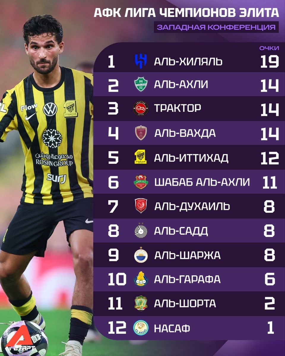 На Западе «Аль-Хиляль» и «Аль-Ахли» голами не отличились, поэтому «Аль-Иттихад» назабивал за всех. Три из семи голов в ворота «Аль-Гарафы» провел экс-полузащитник «Лиона» Уссем Ауар. На Востоке вылетел «Шанхай Шеньхуа» Слуцкого, а «Чэнду» Егора Сорокина еще поборется. Для выхода в плей-офф китайскому клубу нужно победить на выезде «Матиду Зельвию» и ждать нужный результат в параллельных играх. Узнаем всех участников 1/8 финала АФК Лига Чемпионов Элита уже на следующей неделе ⚔ Подписывайся на ТВ СТАРТ в MAX📲