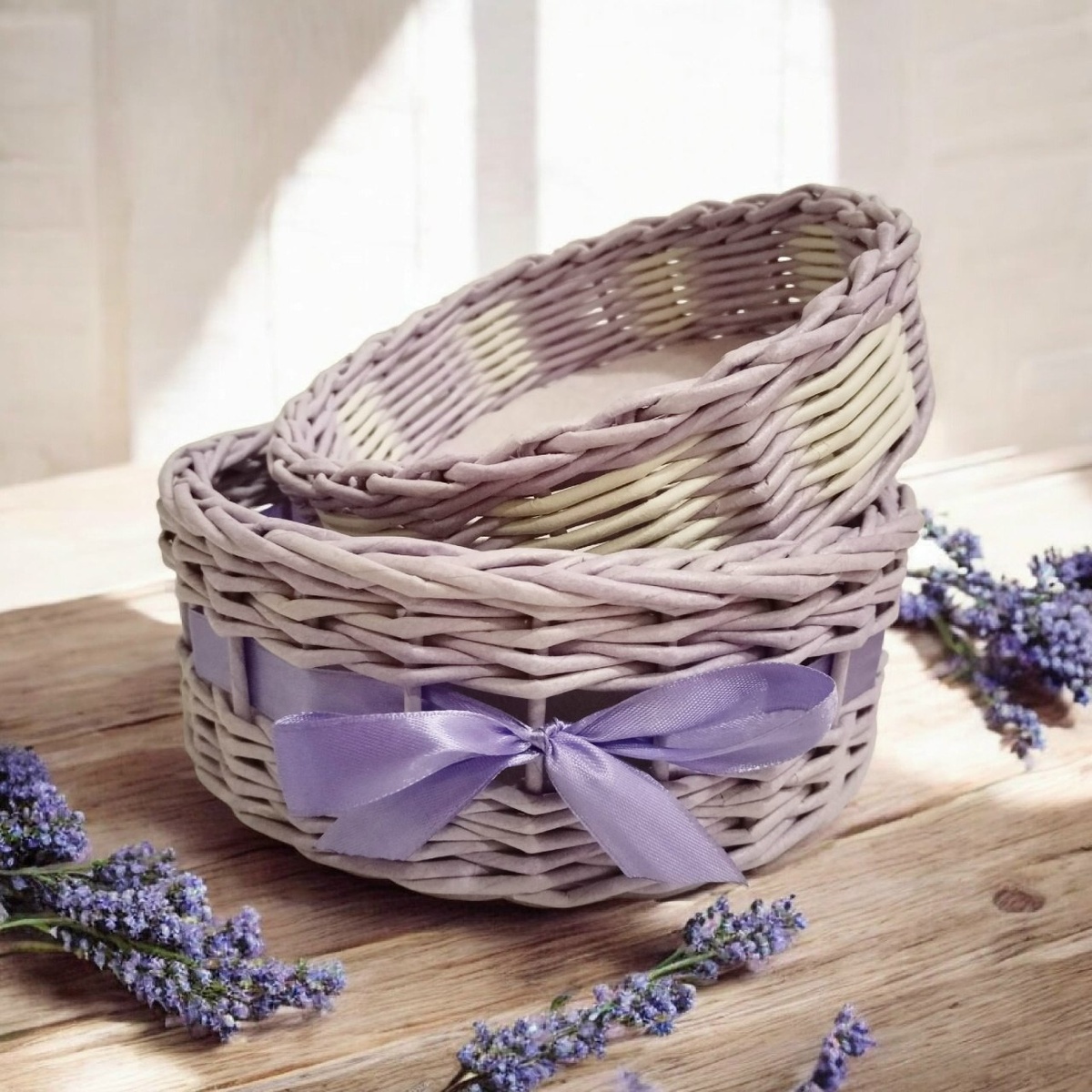 ✨💜 Когда работаешь с такими оттенками, кажется, что сама весна заглянула в мастерскую. Нежно-лавандовые корзинки — это про спокойствие, уют и любовь к своему дому. Работа завершена, ленты завязаны, и эти красавицы уже отправились в новый дом, чтобы радовать свою хозяйку. 🥰 Ставьте 💜️, если вам нравится этот цвет так же, как и мне! Любите лавандовые оттенки? Можете поделиться в комментариях своими лавандовыми элементами декора 👇
