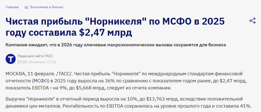 Еще один из крупнейших эмитентов опубликовал отчетность по МСФО за 2025 год — это Норильский никель. Компания одна из немногих на российском рынке, которые смогли продемонстрировать рост финансовых показателей на фоне общего серьезного замедления экономики.