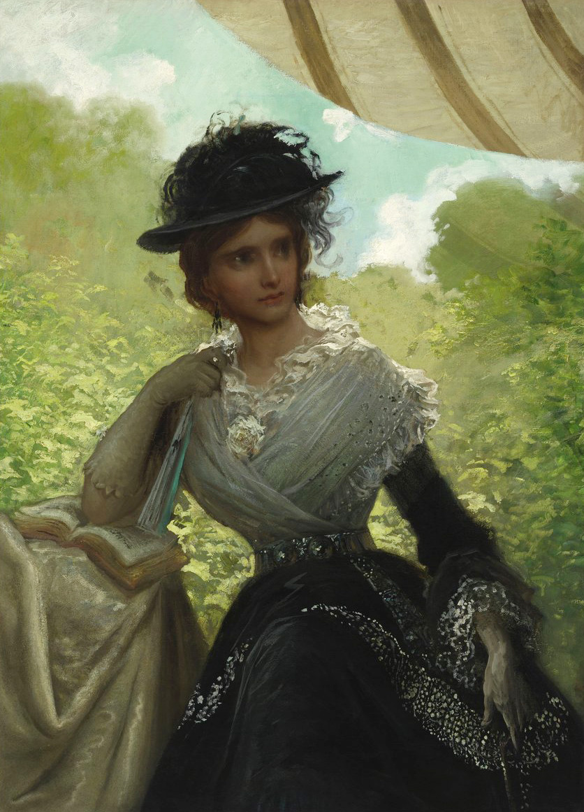 Гюстав Доре (1832–1883), известный прежде всего своими иллюстрациями к литературным произведениям и Библии, всегда оставался открытым для других жанров и техник искусства. Чрезвычайно успешный и плодовитый, он также развивал свои таланты в области живописи, скульптуры и даже дизайна мебели. Стремясь утвердиться как живописец, он выставлял монументальные религиозные композиции в Парижском салоне, а также создавал более камерные жанровые сцены и портреты. На данной картине изображена красивая, модная молодая женщина, сидящая в саду. Её стройная, элегантная фигура подчёркнута белой шалью, обернутой вокруг груди, и поясом, обхватывающим талию. Широкая чёрная юбка, украшенная белым кружевом, шляпа с перьями и тонкие белые перчатки прекрасно дополняют наряд. Она смотрит вдаль, в сторону от зрителя, словно что-то привлекло её внимание во время чтения. Защищённая от резкого летнего света полосатым зонтиком, красавица показана в тени на фоне свежей зелени. Однако резкий контраст между не