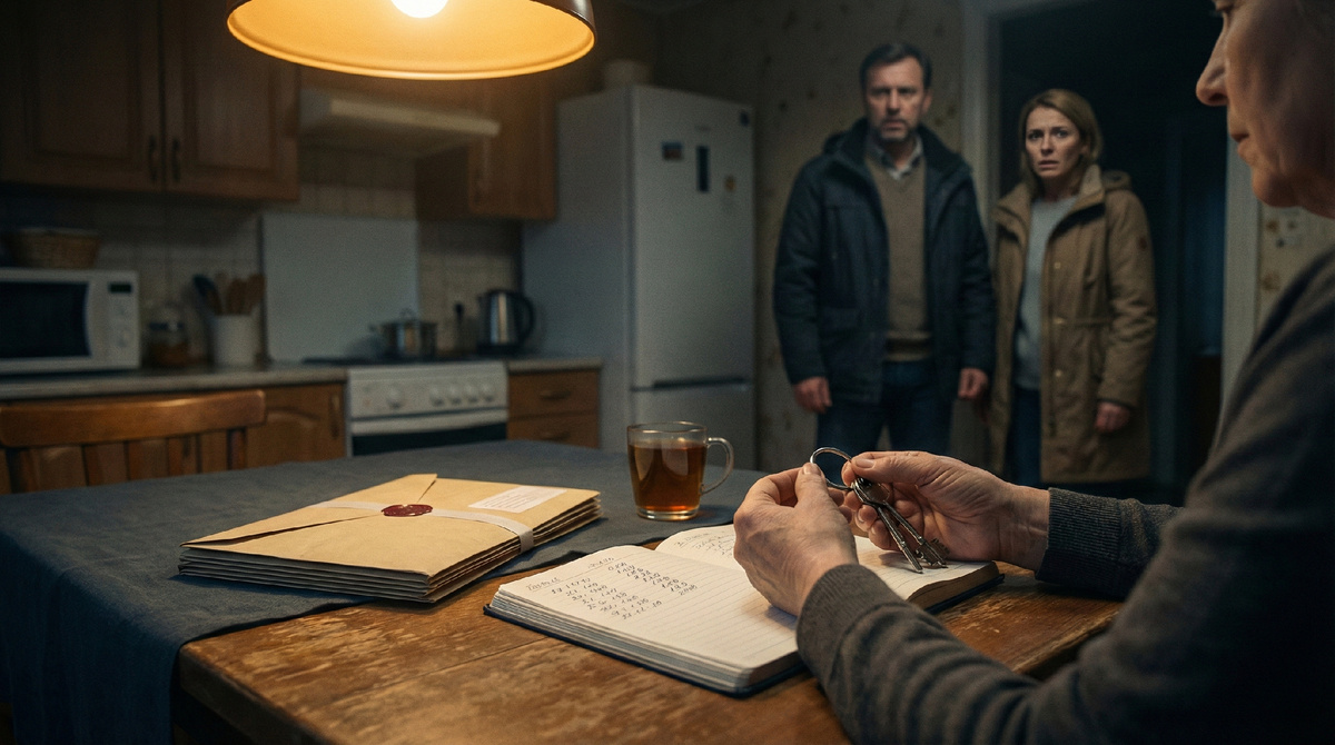 Она подошла к буфету. Открыла дверцу. Взяла кожаную тетрадь и не сразу закрыла. Внутри буфета, за квитанциями, лежал конверт. Конверт был плотный, с ровным краем. На нём — печать. Она знала, что Ольга и Сергей увидят его сразу, потому что взгляд у них теперь был наточен на такие вещи.