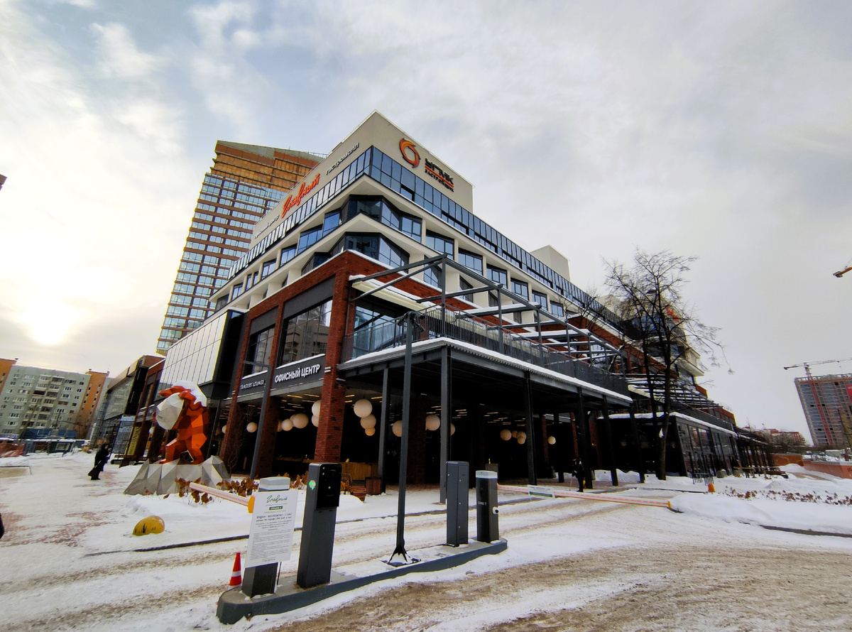 Современное здание — смесь кирпича, стекла и металлических конструкций — выглядит стильно и сразу обращает на себя внимание. Перед зданием стоит трёхметровая скульптура оранжевого медведя.