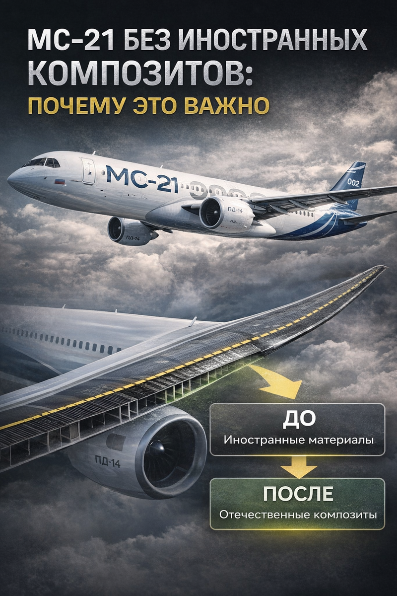 В проекте МС-21 завершён один из самых чувствительных этапов импортозамещения — в конструкции самолёта больше не используются зарубежные композитные материалы. По данным ОАК, одобрены отечественные решения для киля и стабилизатора, включая силовые элементы кессонов. На первый взгляд — просто очередная новость о замене компонентов. На деле — это куда более серьёзный шаг. Современные пассажирские самолёты строятся вокруг композитного крыла и оперения. Эти материалы обеспечивают: До санкционных ограничений часть композитов закупалась за рубежом. После 2022 года это стало одним из ключевых рисков для всей программы МС-21. Замена требовала не просто «найти аналог», а заново: Это годы работы. Последними элементами оставались силовые конструкции киля и стабилизатора. Это не декоративные панели — это части, несущие серьёзные аэродинамические и силовые нагрузки. По заявлению ОАК, теперь самолёт полностью освобождён от иностранных композитных материалов. Параллельно продолжается сертификация вер