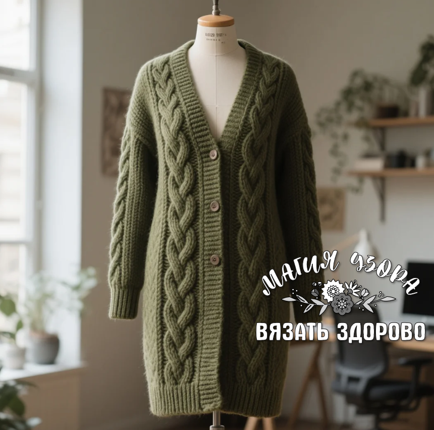 - Вертикальные косы на кардиганах длиной до колена