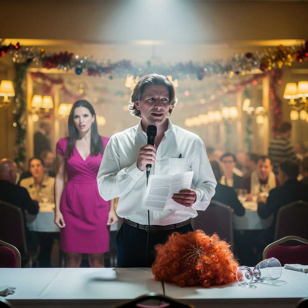 На столе перед Жанной Викторовной лежал парик. Рыжий, кудрявый, с блёстками. Рядом — караоке-микрофон. Конкурс назывался «Голос компании»: надеть парик, выбрать песню, спеть. Зал голосует аплодисментами.