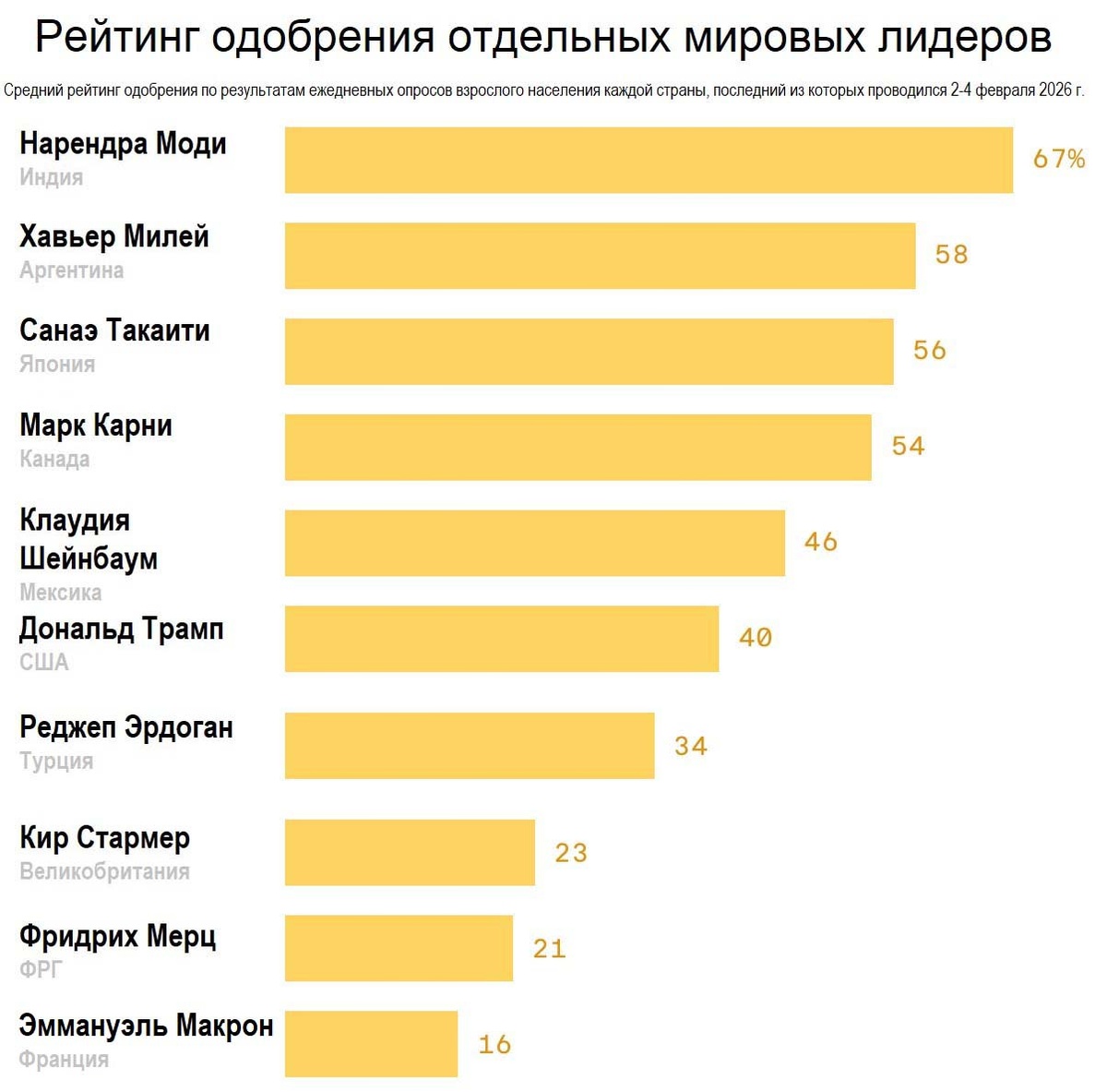 Премьер-министр Великобритании Кир Стармер борется за свою политическую карьеру, вчера отвергнув призывы к отставке, поскольку последствия скандала с делом Эпштейна угрожают крахом британского правительства, пишет Закари Басу из Axios. По данным журнала The Economist, менее чем через два года после убедительной победы лейбористов на выборах Стармер является самым непопулярным премьер-министром Великобритании за всю историю. Однако новые данные Morning Consult показывают, что он даже не самый непопулярный лидер в Европе. Рейтинг одобрения президента Франции Эммануэля Макрона составляет всего 16%, что создает предпосылки для победы крайне правой партии «Национальное собрание» на президентских выборах в следующем году. Канцлер Германии Фридрих Мерц также крайне непопулярен, что отражает широко распространенное в Европе недовольство действующими политиками из-за инфляции, экономической стагнации и иммиграции.