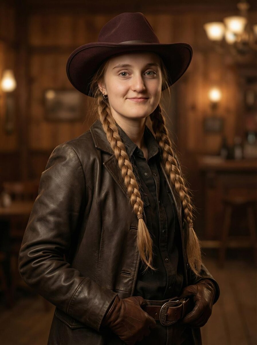Модель: Nano Banana Сгенерировать🪄 Стиль вестерн Использовать загруженное фото как референс идентичности лица. Лицо 1:1 — не менять форму, пропорции, черты, возраст, мимику. Без стилизации. Фотореалистичный женский кинопортрет вестерн + нео-нуар, по грудь/по пояс, лёгкий разворот корпуса, уверенный загадочный образ. Образ (НЕ лицо): коричневая матовая кожаная куртка, тёмный верх, кожаные перчатки, широкий ремень с крупной пряжкой, бордово-коричневая вестерн-шляпа. Причёска по исходному фото, без изменения линии роста. Мягкий кинематографический свет, тёплая палитра, естественная кожа. Размытый винтажный вестерн-фон. Фотореализм, 4K, sharp focus on face. 🚫 NEGATIVE different face, altered facial features, beauty face, plastic skin, ai face, anime, cartoon, stylized, face morphing, symmetry correction