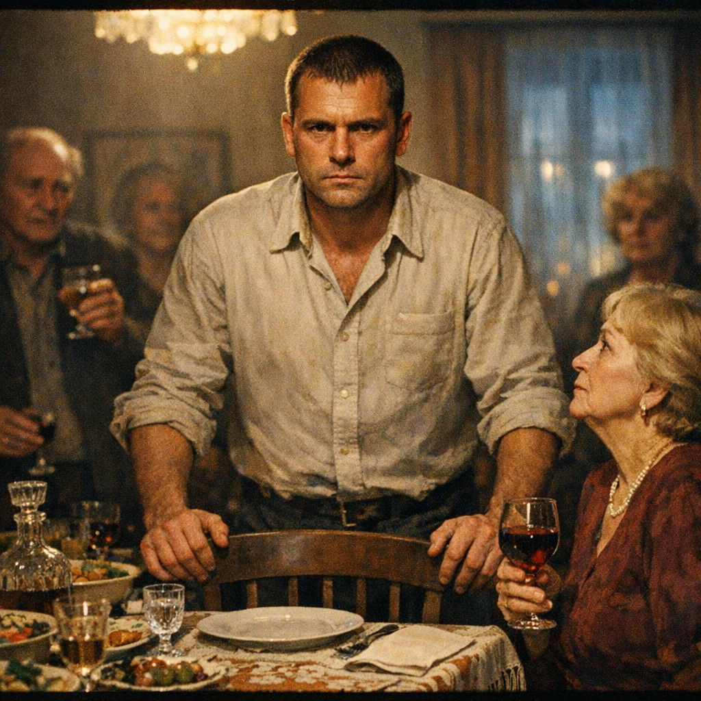 Гости молчали. Тётя Зина смотрела на Валентину Петровну. Дядя Коля смотрел в тарелку — опять. Алла Михайловна поправляла салфетку, хотя та лежала ровно. Роман покраснел до ушей и сжал вилку так, что побелели костяшки.