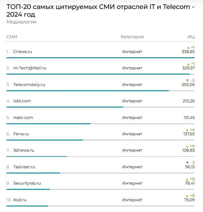 Медиалогия опубликовала рейтинг самых цитируемых ИТ и телеком-изданий за 2024 год. Лидерами рейтинга стали интернет-ресурсы Cnews.ru, Hi-Tech@Mail.ru и Telecomdaily.ru.