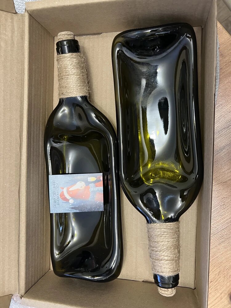 Креативный набор из двух стеклянных тарелок, выполненных из настоящих винных бутылок зеленого цвета. Украшены корковой пробкой и джутом. Прочное стекло, можно мыть в посудомоечной машине.