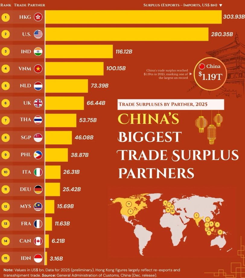 В 2025 г. торговый профицит Китая достиг $1.19 трлн., обновив исторический максимум на фоне усиливающейся геополитической напряжённости и попыток частичного разрыва глобальных цепочек поставок. Несмотря на тарифы, протекционизм США и заградительную риторику Трампа, экспортная машина Китая продолжает работать с высокой эффективностью. Почти половина общего профицита приходится всего на два направления. Гонконг обеспечил Китаю $303.93 млрд., во многом за счёт реэкспорта и транзитной торговли. США заняли второе место с $280.35 млрд., сохраняя хронический дисбаланс, который остаётся политически чувствительным вопросом уже не первое десятилетие. Далее следуют Индия с $116.12 млрд. и Вьетнам с $100.15 млрд. Их позиции отражают углубление торговых связей внутри Азии и перераспределение производственных цепочек, где часть сборки может смещаться в другие страны региона, но ключевые компоненты и промежуточные товары продолжают поставляться из Китая. В первые 15 партнёров также вошли Нидерланды с
