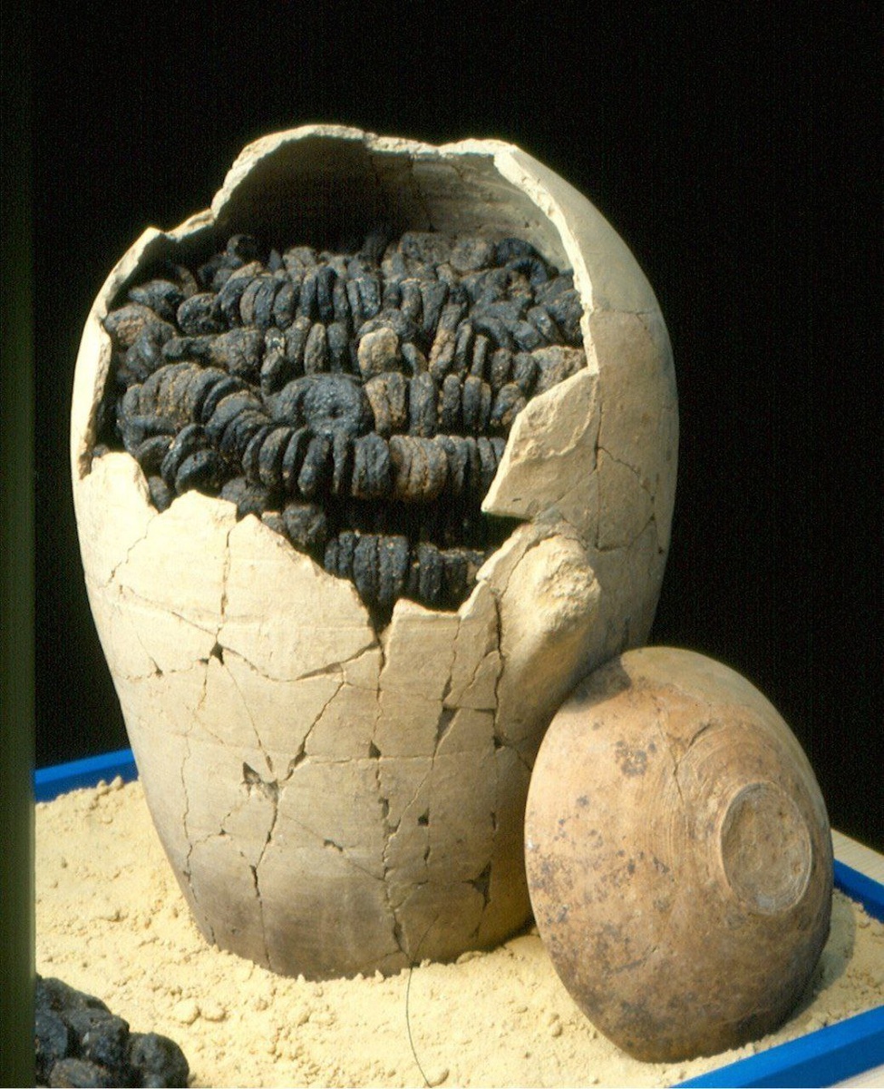 Сгоревший и окаменевший инжир в сосуде для хранения.