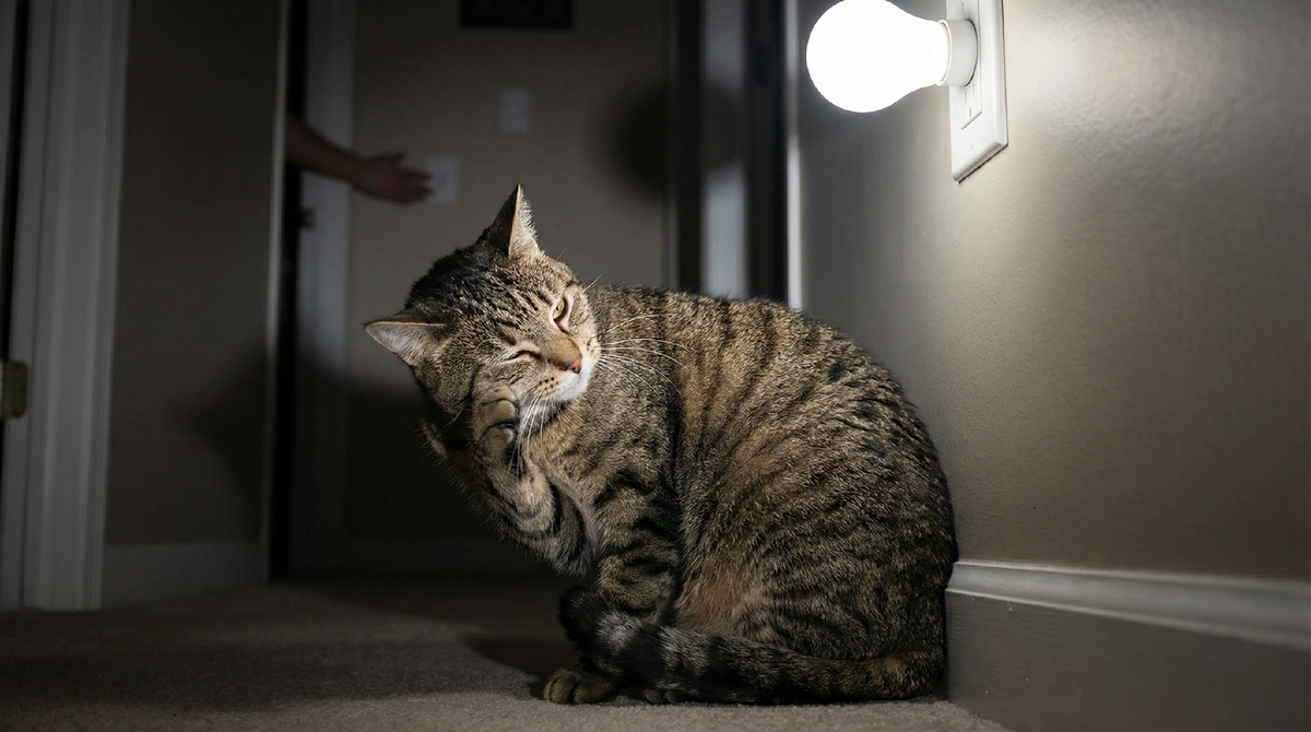 Решение простое. Не включайте яркий верхний свет ночью, когда в доме спит кот. Установите ночник в коридоре — тусклый, тёплый свет, который не бьёт по глазам. Или используйте фонарик на телефоне в режиме минимальной яркости. Этого достаточно, чтобы дойти до туалета, но недостаточно, чтобы разбудить кота.