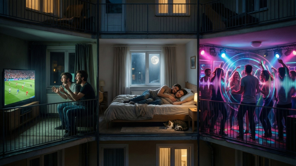 Что слышно: Соседей за стеной может быть почти не слышно. Но ударный и структурный шум (особенно от перфоратора, падения тяжелых предметов, детского бега) часто прорываются. Почему? Потому что борьба с ними требует либо массивных перекрытий, либо сложных развязок (плавающие полы, акустические подвесы), что удорожает строительство.
