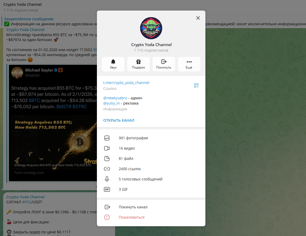 Канал Crypto Yoda Channel существует с 2018 года, но до сих пор не имеет ни устойчивой репутации, ни реальных отзывов от подписчиков. При этом проект активно публикует торговые сигналы по криптовалютам и создаёт впечатление «рабочей стратегии» с чёткими входами, целями и стопами. На первый взгляд — обычный трейдинг-канал. Но если внимательно разобрать историю проекта и логику сигналов, картина становится куда менее оптимистичной. Если вы ищете более прозрачные форматы заработка без сомнительных сигналок и реферального давления, можно посмотреть альтернативы здесь. Там собраны проекты без агрессивных партнёрок и накрученных «успехов». Телеграм-канал @crypto_yoda_channel был создан в 2018 году и к 2025 году набрал около 7 000 подписчиков. Основной администратор — @newtysabro, рекламный контакт — @broxa. Но важный момент: до 2021 года канал имел другую тематику. Старые публикации отсутствуют, что наводит на мысль о перепродаже проекта. С 2021 по 2024 год в ленте публиковались в основном р