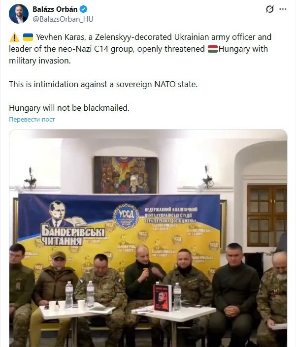 Член Национального собрания Венгрии Балаж Орбан: 'Евгений Карась, офицер украинской армии, награжденный Зеленским и лидер неонацистской группировки C14, открыто угрожал Венгрии военным вторжением. Это запугивание суверенного государства НАТО. Венгрия не поддастся шантажу'.