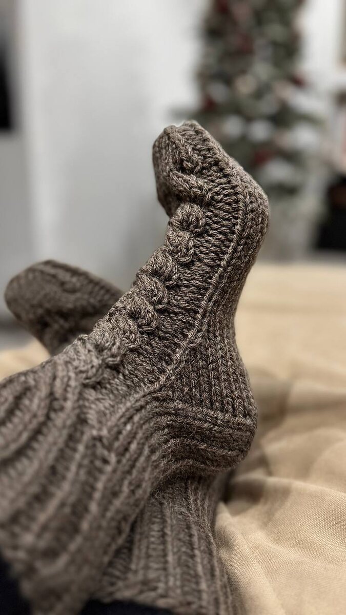))) Носки прекрасные ) идеально для дома! Тепло и даже нарядно, благодаря узору, который расположился по верхней части изделия! Используем толстенькую пряжу 100 гр = 100 метров Спицы под свою руку (я беру 4 мм), чтобы было достаточно туго связанное изделие. Набираем 34 петли (17 верхняя часть и 17 нижняя) Вяжем высоту резинки по вашим пожеланиям и переходим к узорам : 17 верхних петель вяжем по схеме с красивой косой (ее подробно рассмотрим далее) и вторую половину просто гладью ! Связав желаемую высоту голенища мы переходим к формированию пятки. Я люблю самую простую ! Ту, которую всегда бабуля вязала на своих носках: 17 петель вяжем гладью с протяжками (чтобы пятка была плотнее). У меня 18 рядов высота пятки. Далее переходим к формированию самой пятки: делим петли на 3 части 5-7-5 петель. Вяжем центральные 7 и ввязываем боковые 5, провязывая каждый раз 7-ую петлю вместе с боковой Когда осталось всего 7 петель - поднимаем по бокам из «высоты пятки» петли в носок из кромочных (в