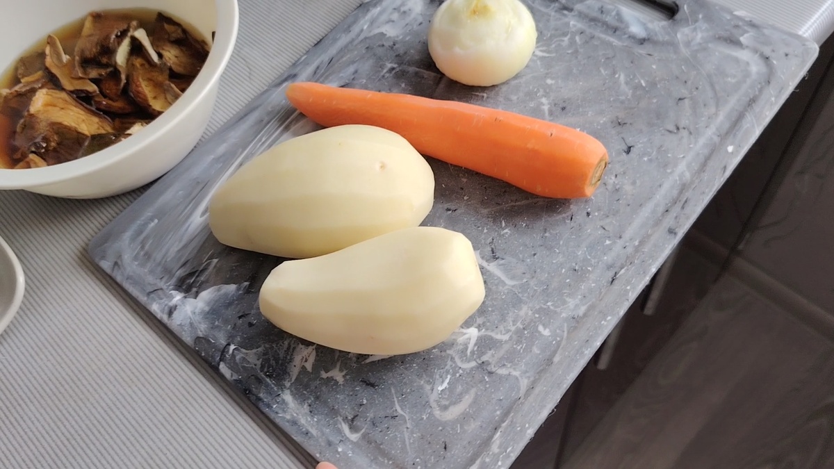 Грибы шампиньоны и я добавила сушёные белые грибы предварительно замочила в воде.