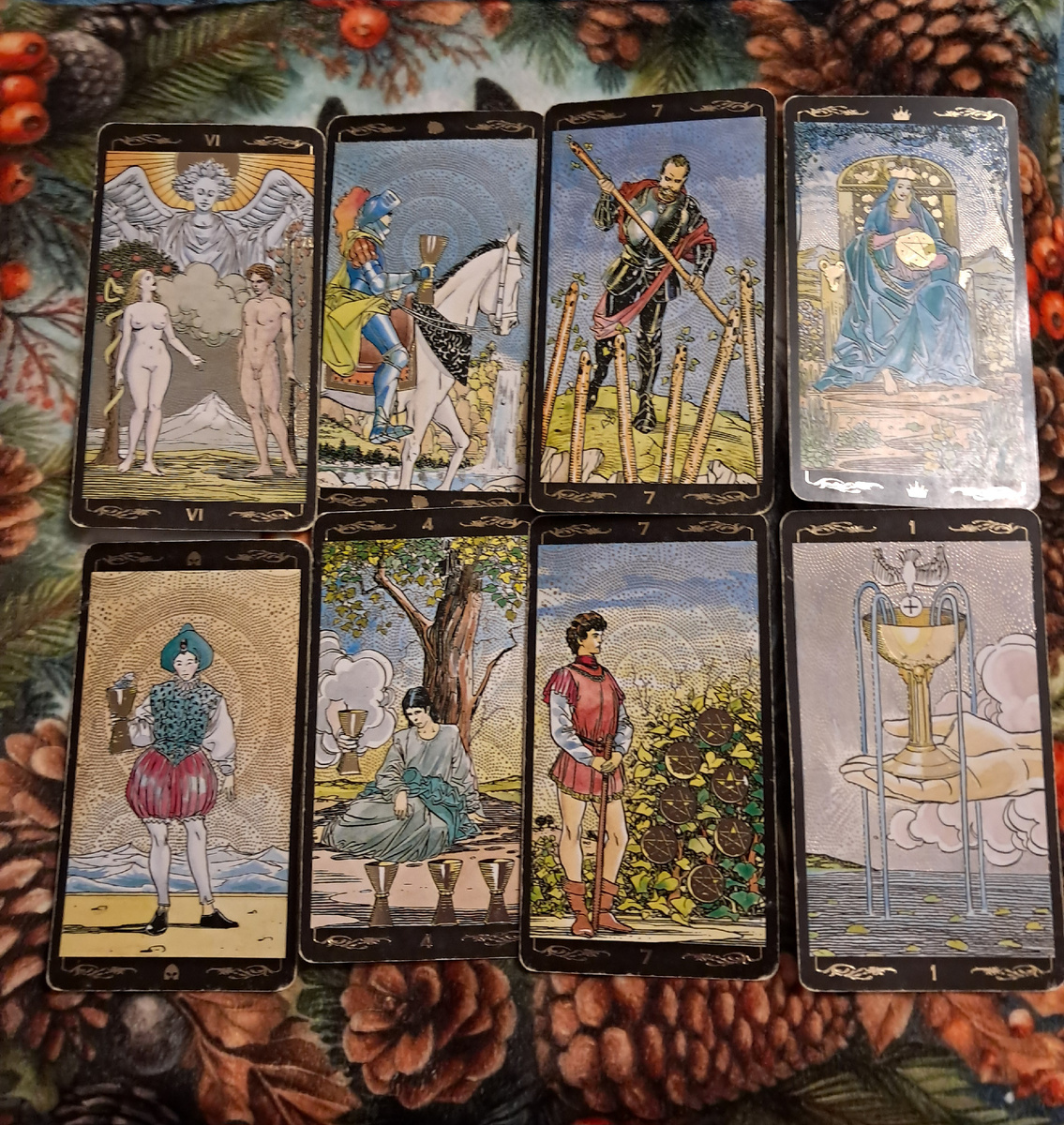 7 Жезлов — вы на холме, отбиваете атаки. В отношениях это период, когда вам приходится отстаивать свои границы. Кто-то пытается вас подвинуть, навязать своё видение, обесценить ваши чувства. Вы будете уставать, но держать оборону.