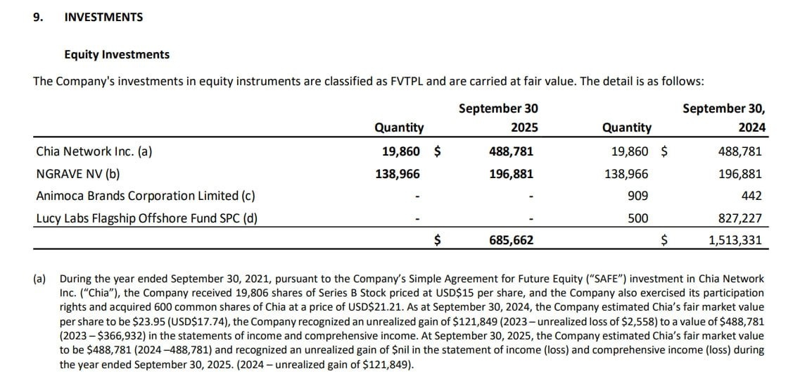Примерно год назад мы оценивали Chia Network через компанию Sol Strategies. Пришло время открыть отчетность за 2025 год и посмотреть, как изменилась оценка Chia. Среди инвесторов Chia Network есть публичный эмитент — компания Sol Strategies. В соответствии с требованиями регулятора она раскрывает отчетность и проводит оценку своих инвестиций. 🍃 В 2024 году Sol Strategies оценивала свои вложения в Chia Network в размере $488 781. В 2025 году эта оценка осталась неизменной, чего не скажешь о цене монеты. Очевидно, что в этой ситуации кто-то неправ. Скорее всего, сейчас ошибаются спекулянты на крипторынке.