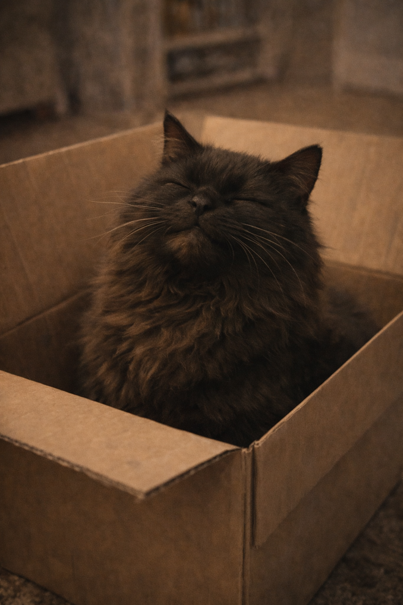 Потом я принял овальную форму. Конечная стадия. Я больше не кот. Я — наполнитель коробки. Её идеальное, пушистое, мурчащее содержимое.