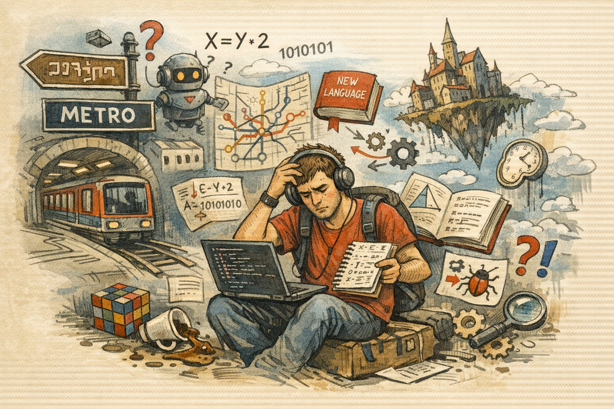 Представьте: вы приехали в незнакомую страну, где нужно одновременно учить местный язык, разбираться в устройстве метро, решать математические задачки на этом новом языке. И ещё эта страна в параллельной реальности, где физические законы работают немного иначе, и их вам тоже нужно усваивать и учитывать. Примерно это и происходит, когда вы изучаете программирование.