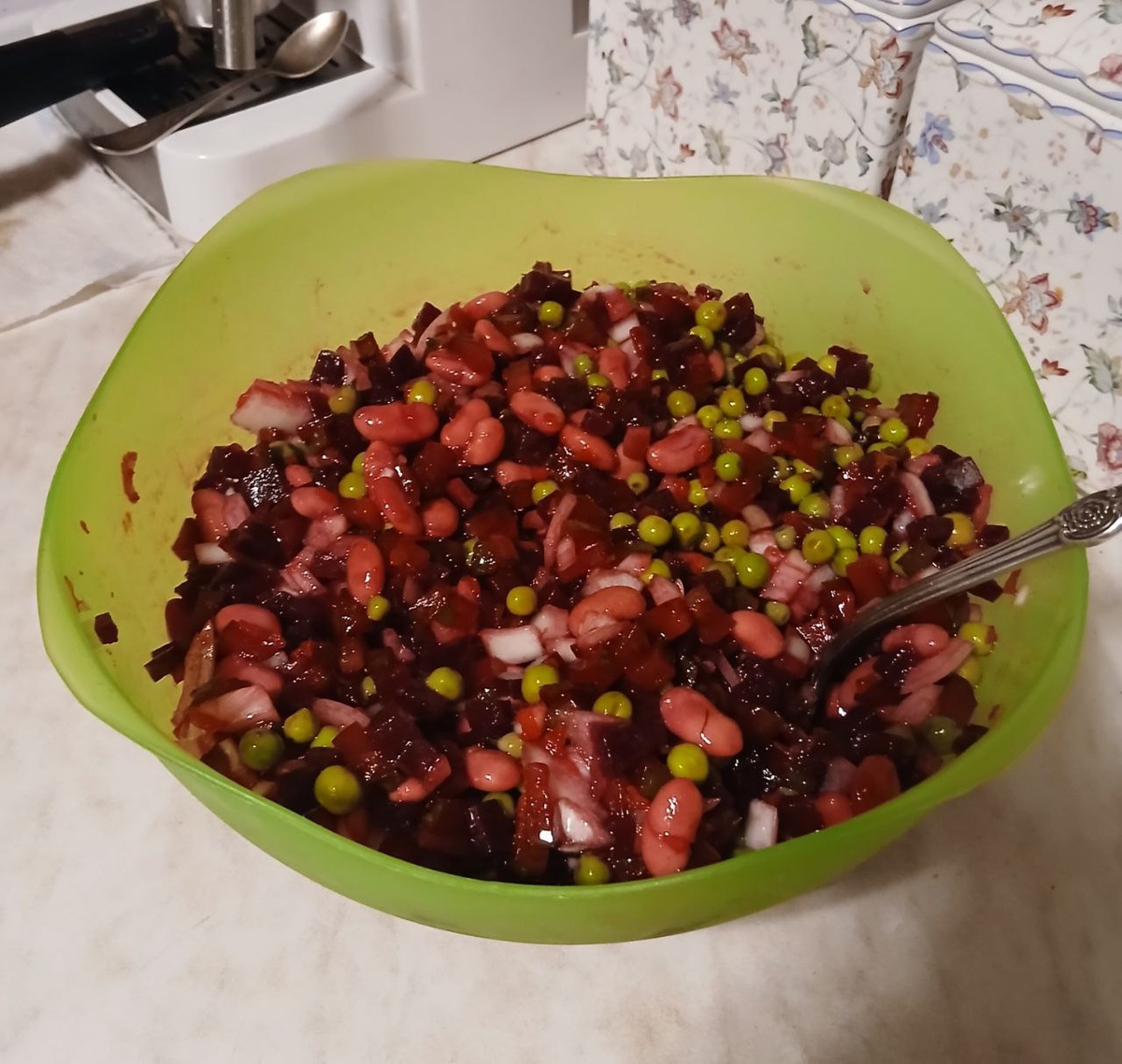 Все очень просто меняем картофель на фасоль и поехали. Не пугайтесь, что у варёных свеклы и моркови высокий ГИ – 70, зато у них низкое содержание углеводов. Нужно всегда соотносить эти два показателя: гликемический индекс и количество углеводов. А чтобы ударно повысить сахар в крови винегретом, нужно съесть его небольшой тазик. Но, смотрите по своему самочувствию. Еще в винегрет просятся ферментированные огурцы или капуста – соленые или квашенные. Можно или одно, или другое. А можно капустку с огурчиками вместе. Кстати, овощи, кроме фасоли, у меня все свои. Выращенные с любовью и переработанные в соответствие с моим вкусом. А маслице берите обязательно душистое – нерафинированное подсолнечное. Ингредиенты: Фасоль 1 банка: Свекла 250 – 300 гр: Морковь 150-200 гр: Огурцы соленые 4-5 щт: Лук 1 шт: Зеленый горошек на ваше усмотрение: Соль по вкусу: Масло подсолнечное нерафинированное. Когда мне поставили диабет второго типа, я каждый продукт проверяла на повышение сахара, КАЖДЫЙ!!! Поэтому