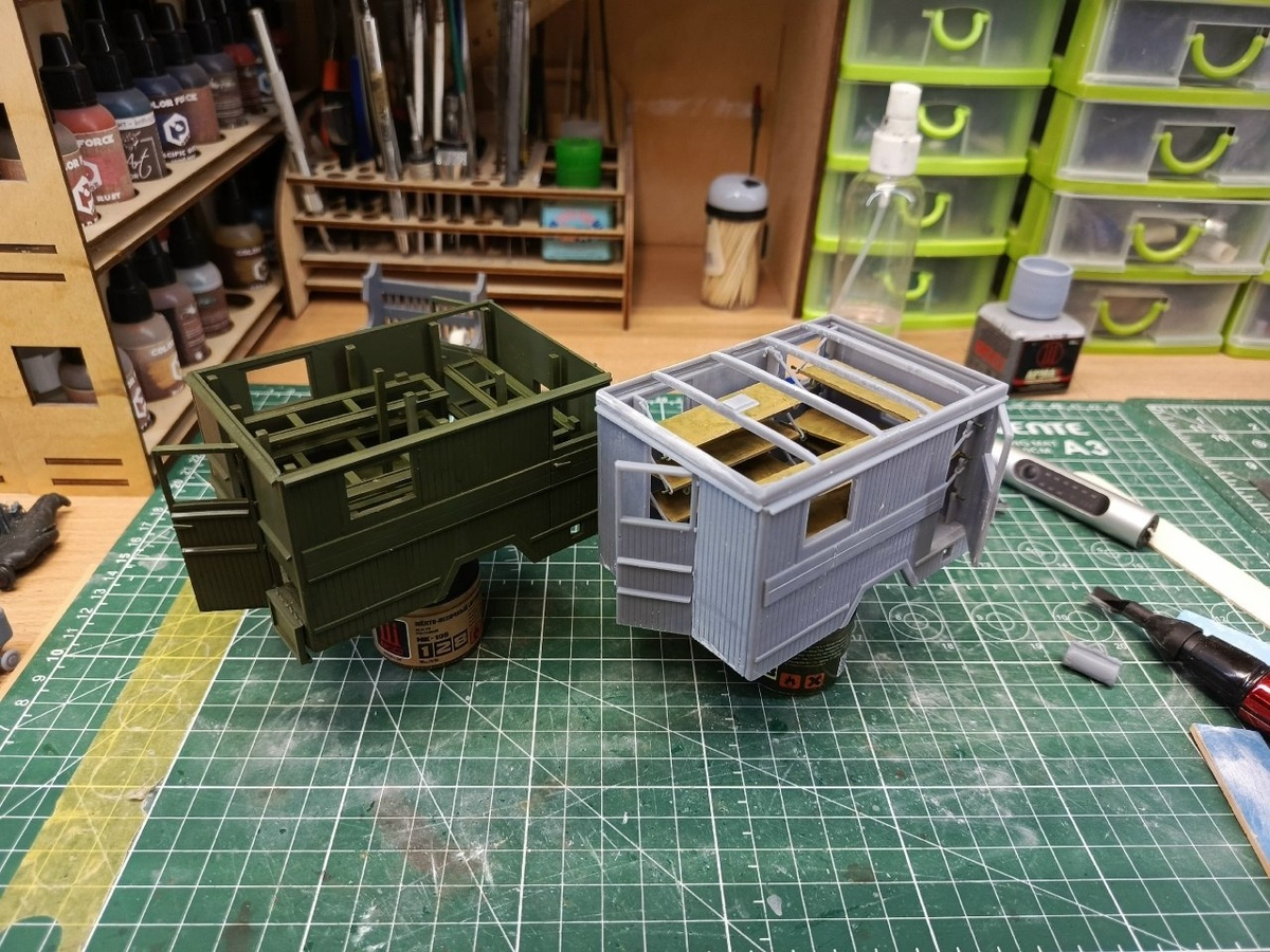 ДМС (denisssmodels) из Кирова показала сборку своих выпущенных на 3D-принтере фургонов для моделей ЗИС-44 образца 1943 года (серый на фотографии) и 1942 года (зеленый) в масштабе 1/35.
