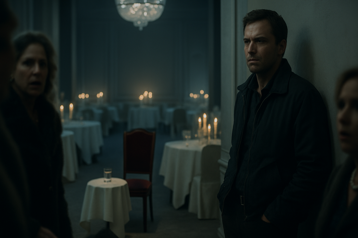 Пустой зал. Белые скатерти. Свечи. И один стул в центре. Один.