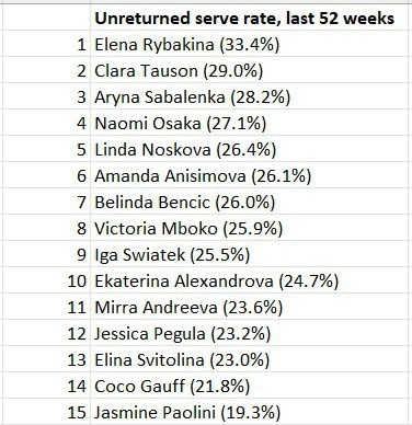 Топ-15 теннисисток WTA с самым высоким процентом подач навылет за последние 52 недели