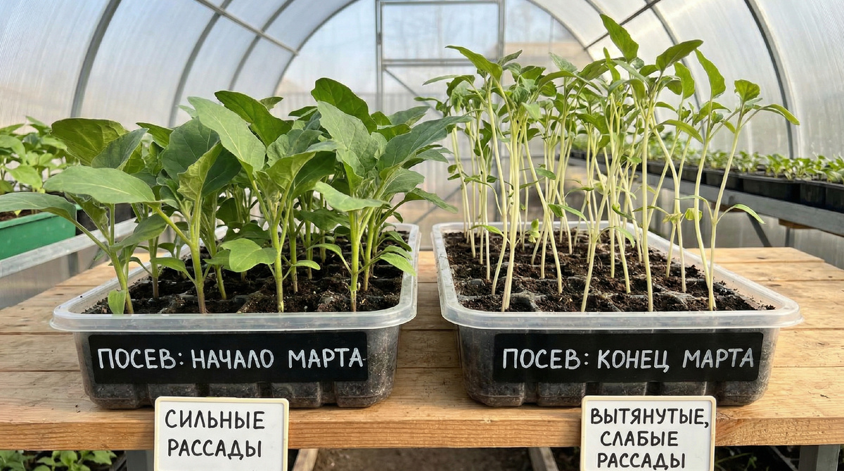 В прошлом году я посеяла баклажаны 25 марта. Казалось — нормально, перцы ведь тоже в марте сею. К июню рассада была — карандашик с тремя листиками. Жалкое зрелище, честно. Высадила, ждала. В августе собрала четыре — четыре! — баклажана с шести кустов. Соседка Наталья к тому времени уже закатывала третью партию икры. Разница между нами? Две недели. Она посеяла 10 марта. Я — 25-го. Пятнадцать дней, которые стоили мне целого урожая. И ведь знала же, что баклажан — тугодум. Но почему-то каждый февраль надеюсь, что «успею в марте». Не успеваю. Баклажан — самый медленный из паслёновых. От всходов до первых плодов у ранних сортов проходит 90–100 дней. У среднеспелых — 115–130. У поздних — до 140. Для сравнения: ранние томаты дают урожай через 80–85 дней, а ранние перцы — через 100–110. И ещё: рассаду баклажанов выращивают 60–75 дней до высадки. Плюс 7–10 дней на прорастание семян. Плюс 5 дней на закалку перед высадкой. Итого от посева до грядки — минимум 75 дней. Вот и считайте. Если высажива
