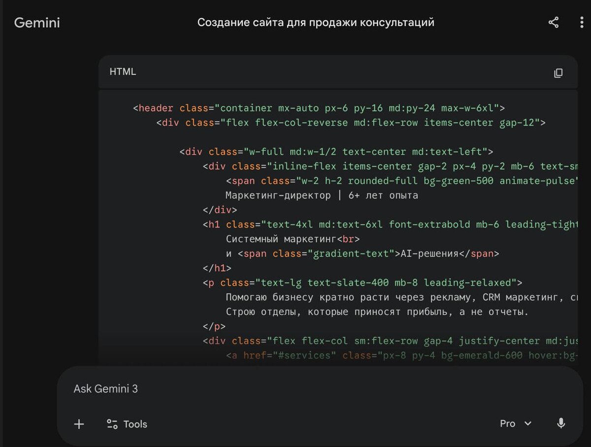 Гайд для новичков Раньше, чтобы сделать сайт, нужно было учить HTML, CSS, нанимать программистов... Сейчас у вас есть личный бесплатный или почти бесплатный веб-разработчик нейросеть (ChatGPT, Gemini или Claude). Сегодня мы сделаем простую, но стильную страницу-визитку. Всё, что вам нужно это скопировать мои промпты (команды) и отправить их в чат с ИИ. Шаг 1. Ставим задачу Нам нужно получить структуру сайта (скелет). Не просите сразу "красивый сайт", иначе нейросеть выдаст кашу. Действуем по шагам. «Действуй как опытный веб-разработчик. Мне нужен код для простого одностраничного сайта-визитки. Структура должна быть такой: Шапка сайта с крупным заголовком "Привет, я [Ваше Имя]". Секция "Обо мне" с парой абзацев текста-рыбы (placeholder). Секция "Мои услуги/навыки" в виде простого списка. Подвал (footer) с контактами: телефон и email, политикой конфиденциальности и ПД. Используй современный HTML5. Пока не добавляй никаких стилей и красок, мне нужна только чистая структура.» Что