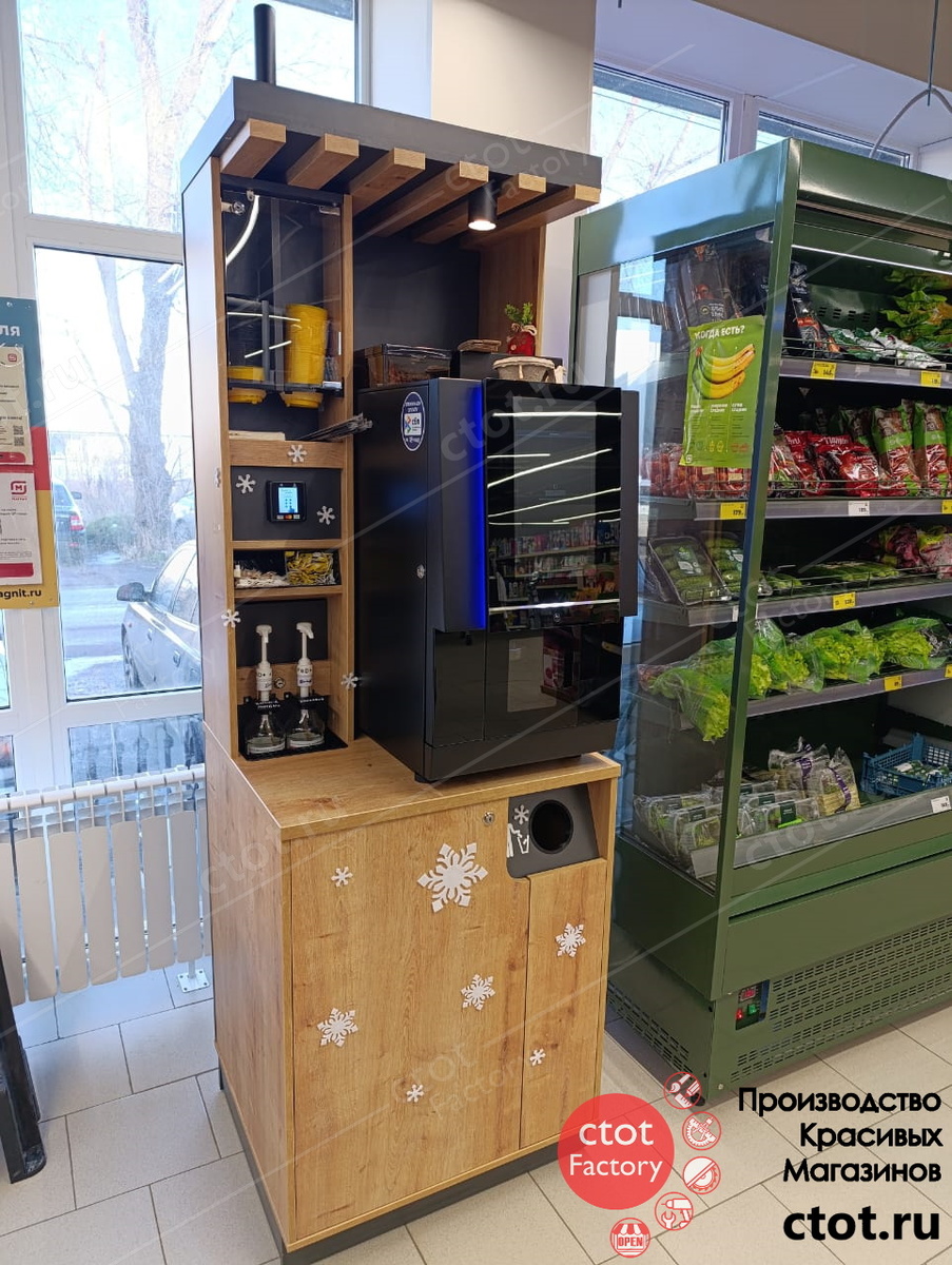 В условиях растущей конкуренции в ТЦ особенно важно создать компактное пространство, которое работает на привлечение, удержание и удобство. Именно таким решением стал кофе-модуль КМ-442785, спроектированный и произведенный фабрикой Ctot Factory. Покупатель часто принимает решение не рационально, а под влиянием среды. Кофейный корнер спроектирован именно так, чтобы работать на эффект вовлечения. Натуральная древесная текстура создаёт ощущение тепла и уюта, формы не перегружают пространство торгового центра, аккуратная верхняя надстройка с подсветкой визуально выделяет модуль в потоке, а декоративные элементы добавляют индивидуальности.
