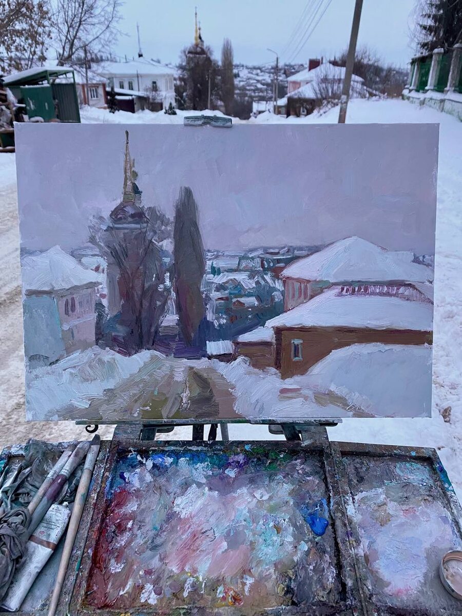 ! 🥶 Ещё один холст из морозного Ельца... почти вечерний ❄️🎨 Писала его на одном дыхании, а точнее — на пределе сил, потому что холод в тот день стоял дикий. Холст, масло, 50х70 см. . Art demands sacrifice, and winter plein air requires titanic patience! 🥶 Another canvas from frosty Yelets... almost evening-like ❄️🎨 I painted it in one breath, or rather, at the limit of my strength, because the cold that day was brutal. Oil on canvas, 50x70 cm/20х28in #yelets #JuliyaZhukovaArtist #winterpleinair #oilpaintings #argamach #елец #ЮлияЖуковаХудожник #зимнийпленэр #картинымаслом #аргамач