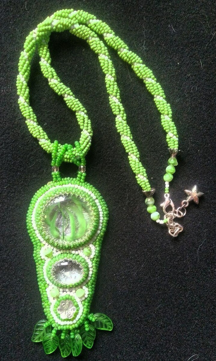 В работе использован чешский круглый бисер номер 10 и японский круглый бисер номер 15, стеклянные кабошоны, стеклянные бусины в форме листиков, плоского цветка и круглые. Подвес - американский жгут.