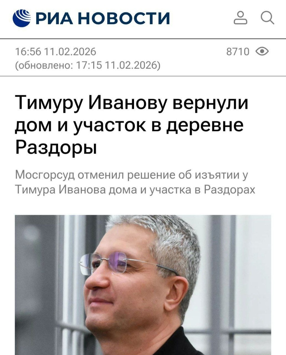 Мосгорсуд рассматривал жалобы защиты и представление прокурора на решение обратить в доход государства имущество Иванова и его близких на более чем 1,2 миллиарда рублей. Заседание проходило в закрытом режиме. По его итогам инстанция постановила исключить из списка изъятого земельный участок и жилой дом. Занавес... 🇷🇺 Оператор 13 - будь в курсе новостей 🔥 ⚡️Наш чат👉🏻 - курилка 🚬 обратная связь 🤝🏻 поддержать 🇷🇺 Мы в MAX