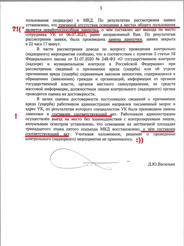 Васильев Д.Ю. полностью проигнорировал данный факт, не дал правовой оценки, не передал материалы в правоохранительные органы. Вместо этого в ответе воспроизводятся данные УК, а письменное доказательство ресурсоснабжающей организации фактически проигнорировано.