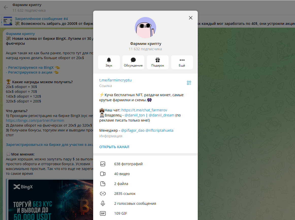 Канал «Фармим крипту» с аудиторией 11 632 подписчика подаётся как источник бесплатных NFT, раздач монет и «самых крутых фармилок». В описании — халява, схемы, активный чат и прямые контакты владельца. Всё выглядит как дружелюбное комьюнити для тех, кто хочет зарабатывать в крипте без вложений. Но если убрать эмоции и внимательно посмотреть на механику, становится понятно: перед нами типичный реферальный канал, где основной заработок идёт не на крипте, а на обороте подписчиков. Если вам интересны более понятные и спокойные форматы заработка без обязательных регистраций и «прокрутки» десятков тысяч долларов, можно посмотреть альтернативу. Там собраны проекты без агрессивных партнёрок и схем с повышенным риском. Типичный пост — «Новая халява от биржи BingX». Обещают от 30 до 480 долларов за участие в акции. Условия выглядят просто: Подача лёгкая: «условия максимально простые», «можно залутать пару долларов», «KYC не нужен». Для новичка всё выглядит как безопасная возможность заработать. П