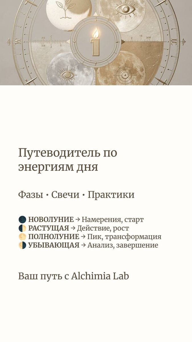 ЧЕРЕПАХА. Фаза IV (Убывающая Луна) Рекомендуемые свечи: Основные: Внутренний компас, Мудрость, Лунная энергия Альтернативные: Гармония, Интуиция, Тепло семейного очага Суть дня: День пассивности, мудрого бездействия, внутреннего созерцания и самоуглубления. Энергия направлена вовнутрь, замедляет процессы. «Торопись медленно». Отличный день для получения знаний через интуицию. Что делать можно и важно: - Провести время в уединении, на природе. - Медитировать, размышлять о жизни. - Посещать баню, бассейн, быть у воды. Что делать не стоит: - Суетиться, спешить, общаться в шумных компаниях. - Употреблять кофе, алкоголь — всё, что забивает тонкое восприятие. Свеча-помощник Alchimia Lab: «Внутренний компас» (белый, кофе). Почему именно она: Помогает в самоуглублении, останавливает внутренний диалог и позволяет услышать тихий голос души — вашу истинную мудрость. Мини-ритуал на 5 минут: Зажгите свечу. Сядьте, свернувшись «калачиком». Закройте глаза и представьте, что вы — черепаха в с