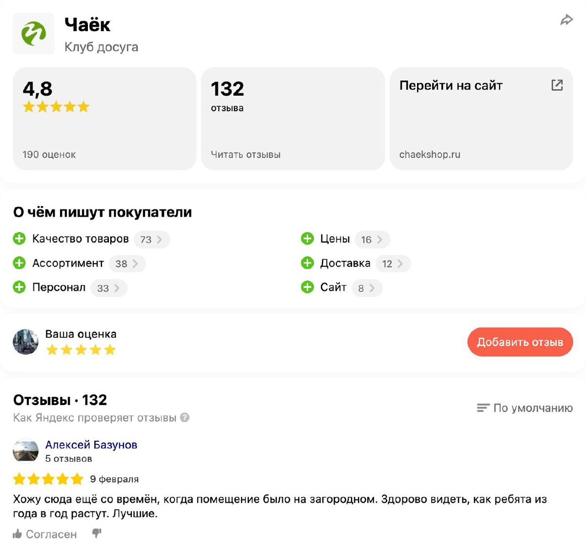 ? Друзья, очень хотим попросить вас рассказать о своих впечатлениях о нашем проекте. Можете рассказать о посещении нашего магазина, поделиться опытом дегустации на чайной встрече или пользовании нашим интернет-магазином. Будем рады всему! Пожалуйста, оставьте отзыв в сервисе «Яндекс Карты» по ссылке ниже: 👉 reviews.yandex.ru/shop/chaekshop.ru Ваши оценки и комментарии помогут другим клиентам узнать больше о нас! С любовью, ваш ЧАЁК 💚