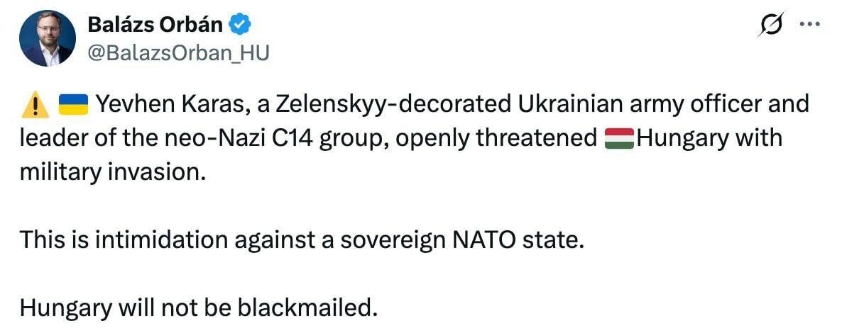 * Советник премьер-министра Венгрии Виктора Орбана Балаж Орбан прокомментировал угрозы украинского неонациста Евгения Карася* о готовности ВСУ вторгнуться в Венгрию. «Евгений Карась*, офицер украинской армии, награжденный Зеленским и лидер неонацистской группировки C14**, открыто угрожал Венгрии военным вторжением. Это запугивание суверенного государства НАТО. Венгрия не поддастся шантажу», — написал советник венгерского премьера в соцсетях * Внесён в перечень террористов и экстремистов. ** Запрещённая в России экстремистская организация. Сайт "Другая Украина" / Telegram / Вконтакте / Центр поддержки Украинцев / Жалоба на ТЦК "Другая Украина" теперь в МАХ