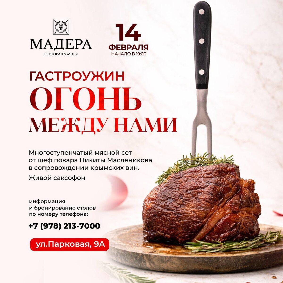 » 14 февраля ресторан «Мадера» приглашает провести День всех влюблённых в атмосфере вкуса, эмоций и тонкого настроения. Гастроужин «Огонь между нами» — это вечер для двоих, где гастрономия становится языком чувств. Для гостей подготовлен многоступенчатый мясной сет от шеф-повара Никиты Масленикова, дополненный тщательно подобранными крымскими винами. Каждый курс раскрывает глубину вкуса и создаёт настроение особенного вечера. Музыкальным сопровождением станет живой саксофон, наполняя пространство мягкими, чувственными акцентами и создавая идеальный фон для романтического ужина. В программе вечера: гастрономический мясной сет из нескольких курсов от шеф-повара Никиты Масленикова; сопровождение крымских вин; живой саксофон; атмосфера камерного романтического вечера у моря. Дата и время: 14 февраля, начало в 19:00 Адрес: ул. Парковая, 9А Бронирование столов и информация: +7 (978) 213-7000 Количество мест ограничено. Рекомендуем бронировать стол заранее. Реклама. ООО «АКВАФУД РУ». ИН