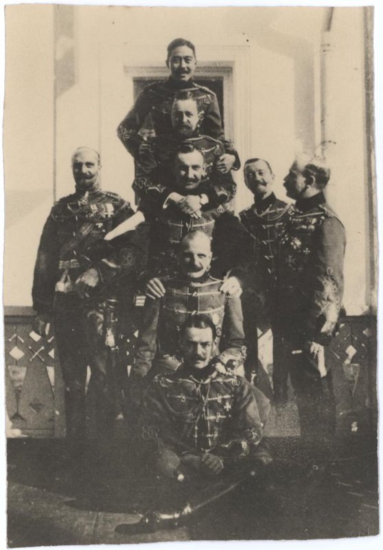 Офицеры Лейб-гвардии Гусарского ЕВ полка во дворе дома командира полка в Царском Селе на Волконской улице (Парковая), не которые Най-Пум, Соллогуб, Воейков и др., внизу Воронцов #ЦС #РИА (фото ужасное что получилось).
