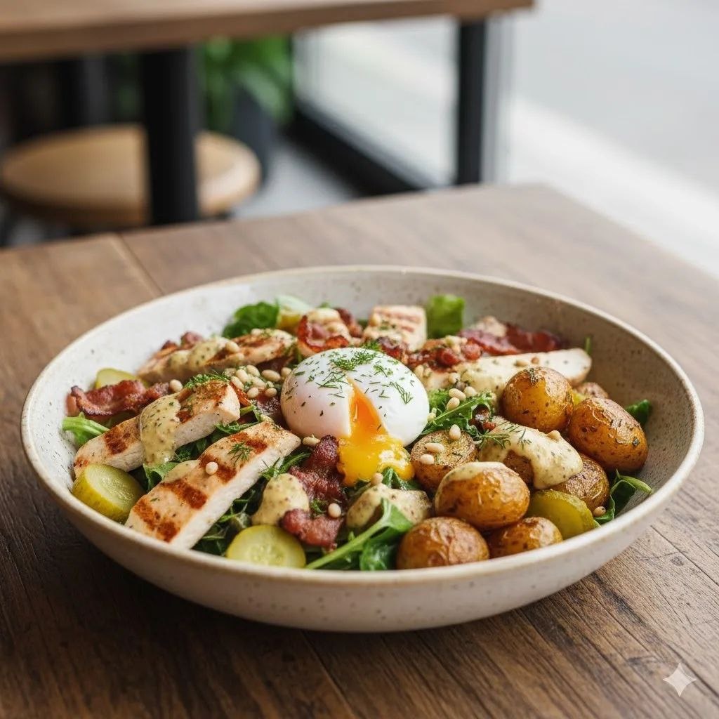🥗 ⏱20 минут | 210 ккал(100 г) 🛒Что нужно: 🍗Куриное филе (гриль или копченое) — 200 г 🥔Картофель беби (отварной или запеченный) — 150 г 🥓Бекон обжаренный — 2 шт. 🥗Листья салата или микс зелени — 50 г 🥒Огурцы маринованные — 2 шт. 🥚Яйцо пашот или вареное — 1 шт. 🍯Горчица зернистая — 1 ч.л. 🥣Греческий йогурт или легкий майонез — 2 ст.л. 👩🍳Как готовить: Нарежьте курицу и картофель крупными дольками. Бекон мелко покрошите, а огурцы измельчите кружочками. Смешайте йогурт с горчицей для заправки. Выложите на тарелку листья салата, сверху распределите все ингредиенты, заправьте соусом и аккуратно выложите сверху яйцо. Посолите и поперчите по вкусу перед самой подачей. Вкусные Рецепты 😋