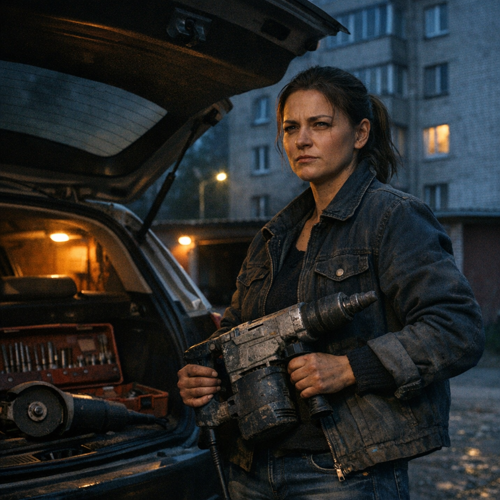 Три ходки. Четвёртый этаж, без лифта. К машине — через двор, мимо лавки, где сидели пенсионерки. Они смотрели, как женщина с волосами за ухом тащит перфоратор в багажник.