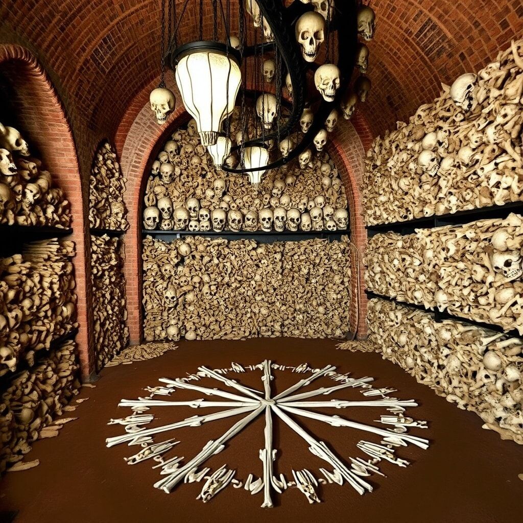 Кости. Горы костей, аккуратно уложенные в нишах, сложенные штабелями вдоль стен, подвешенные к потолку на толстых железных цепях. Рёбра, похожие на согнутые арки собора, черепа величиной с телегу, бедренные кости длиной в три человеческих роста. Но самое жуткое — они были не просто сложены. Они были расположены в определённом порядке, создавая на полу узоры, напоминающие то ли звёздную карту, то ли ритуальный круг.