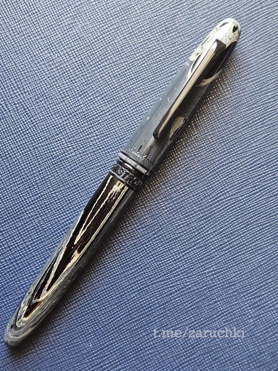 >. Esterbrook был самым мощным производителем ручек в США, утверждается что они производили на пике 216 млн ручек в год. Сейчас торговой маркой владеет Kenro Industries и у них вполне неплохо получилось возродить марку. Ручки можно встретить много где - в магазинах, на выставках, также они выпускают в ассортименте сопутствующие товары, например, чехлы. Я видел перьевые ручки Esterbrook в магазинах и на Penfest. Большинство выглядит относительно дешево и с завышенной ценой, относительно того, что получаешь в итоге. Только модели Estie, из того что я пробовал выделялись и были достойны внимания. Esterbrook Estie Astronaut Acutron выполнена в сотрудничестве с часовой компанией Acutron. Лого Acutron выгравировано не пере. С пером была отдельная история. На пере был скол черного покрытия. Продавец предлагал отправить ручку или перо обратно в Китай, что было довольно накладно. В итоге перо мне выслали Esterbrooks, но отвечали очень долго и я было подумал, что мое мнение очень важно для ни