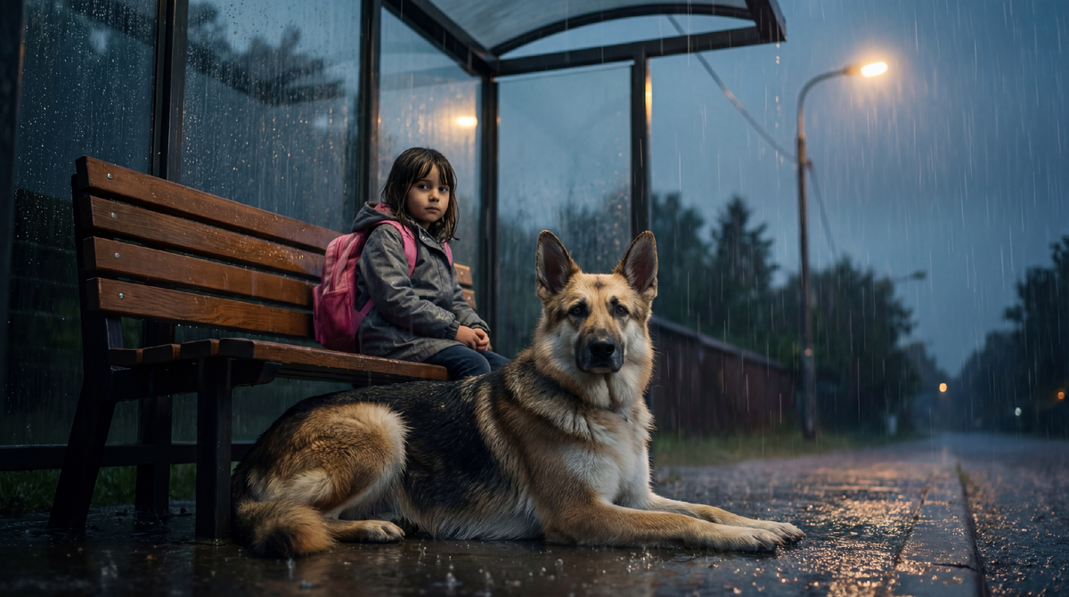 Потом овчарка подошла ближе. Легла на мокрый асфальт рядом со скамейкой и положила морду на лапы. Не лаяла. Не рычала. Просто легла, как будто это её место. Девочка медленно, очень медленно протянула руку и коснулась мокрой шерсти. Собака не шелохнулась.