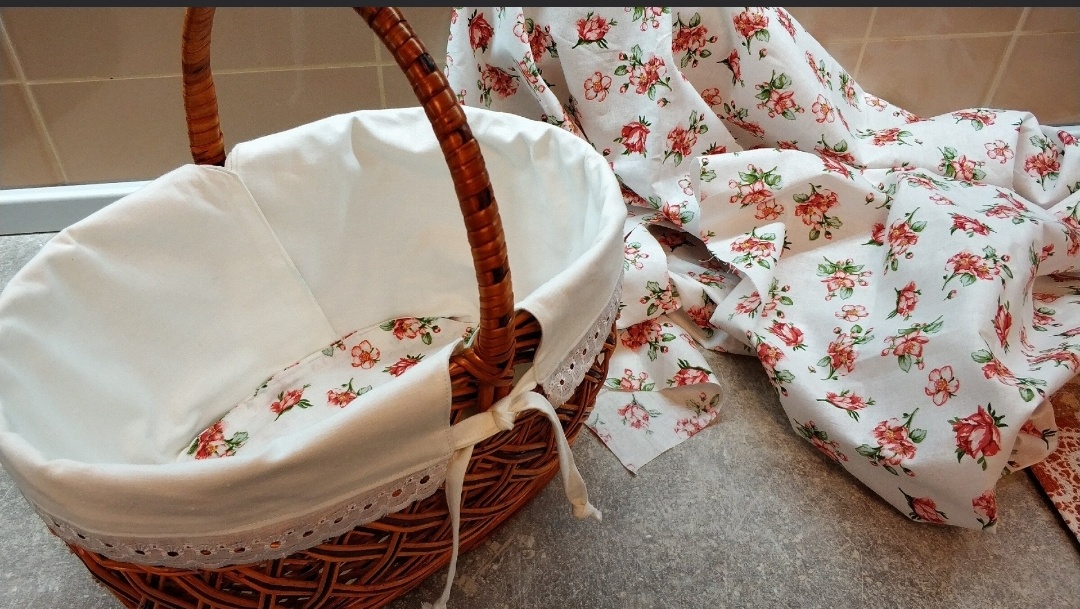Получается шикарный вид корзинки, как говорится и в пир и в мир, при этом убранство легко разбирается на три составляющие, имеющие плоский вид, а это значит, что эти детали легко будет выстирать и отутюжить, а также хранить или переносить.